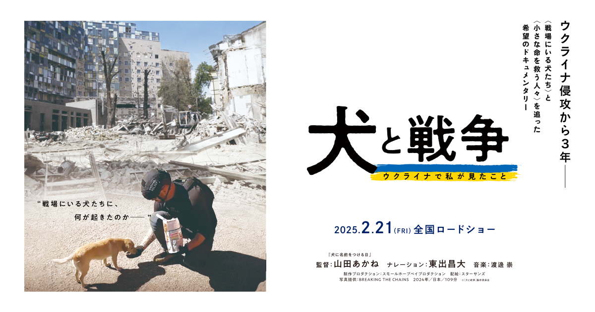 2022年2月から始まったロシアによるウクライナ侵攻。これまでに数々の作品で犬や猫の命をテーマに福島や能登などの被災地への取材を重ねてきたドキュメンタリー映像作家・山田あかねは、<戦場にいる犬たちの現実を伝えなければ>という覚悟のもと、侵攻から約1ヵ月後、戦禍のウクライナでカメラを回す。そして、ある衝撃的な事件を知ることになる。「戦場にいる犬たちに、何が起きたのか?」――その真相を探るため、3年にわたりウクライナへ通うことになった。ナレーションは俳優の東出昌大。猟師として日々命の現場に立つ東出の言葉は、私たちに現実を突きつける。