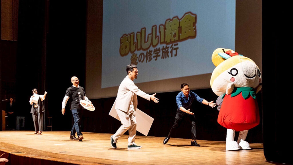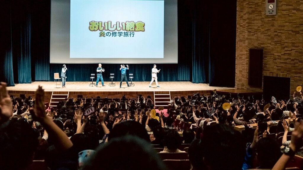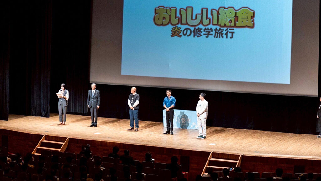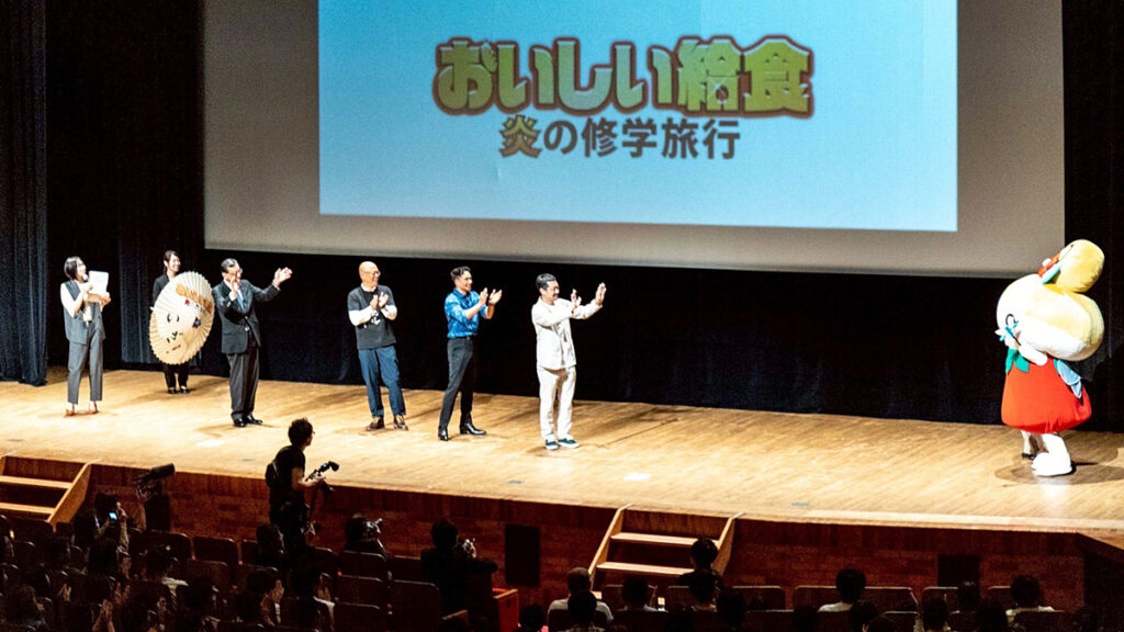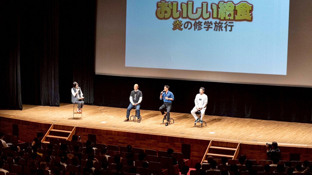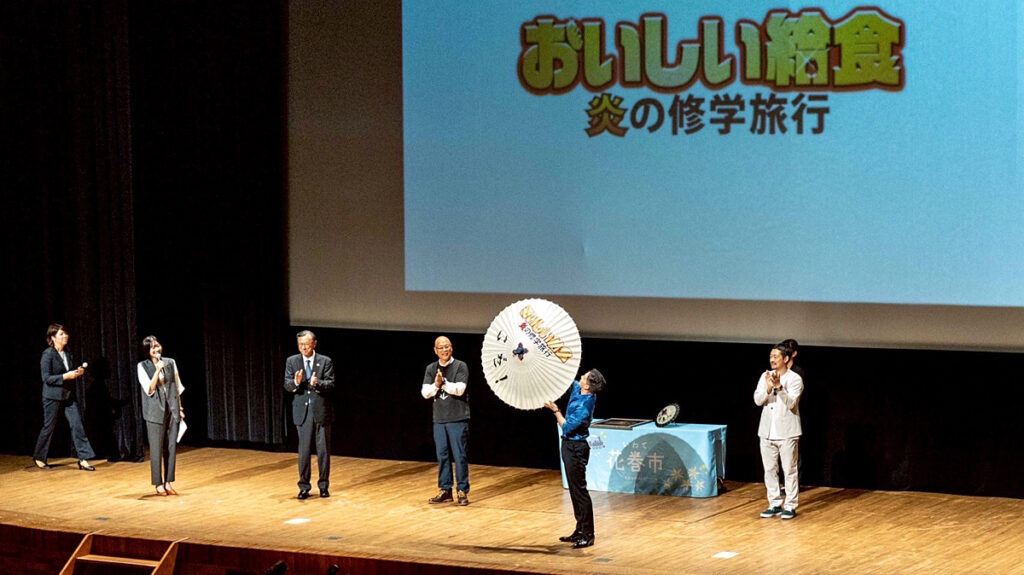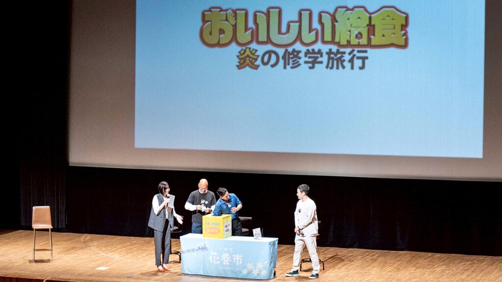 市原らがステージに登場すると、会場は大歓声に包まれる。トークショーが始まる前に、上田東一花巻市長より映画のロゴが入った花巻傘と宮沢賢治にちなんだ絵柄が施されているハンカチの記念品が贈呈された。花巻市長は、「花巻でロケをしたというご縁で、先行上映をしていただくことについて御礼を申し上げたい」と3人へ感謝の言葉を贈ると共に、「花巻のロケ地での場面も登場します。そこで描かれる“おいしい給食”の場面を楽しみに拝見させていただきたいと思います」と本作への期待のコメントを述べた。