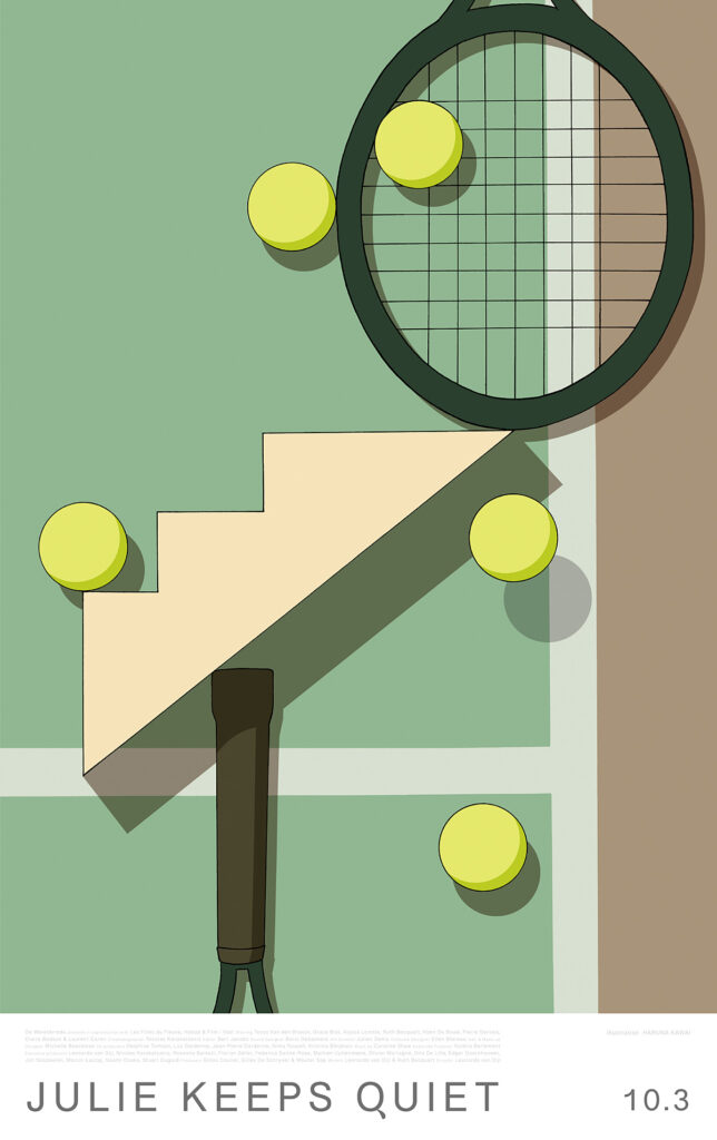 併せてアーティストのカワイ ハルナからは本作をイメージしたイラストポスター2種も到着。幾何形態を組み合わせた独自の造形物を描くことでも知られるカワイ。物体と物体の関係性に興味があり物理現象を観察して絵を作っており、展示を中心に、書籍の装丁やプロダクトも手がけているが、本作で今回は<テニス>という本作の重要なテーマであり、主人公ジュリーの心を象徴するキーワードに想いを込め、見る人の心を捉えるキャッチーなビジュアルを描き出している。