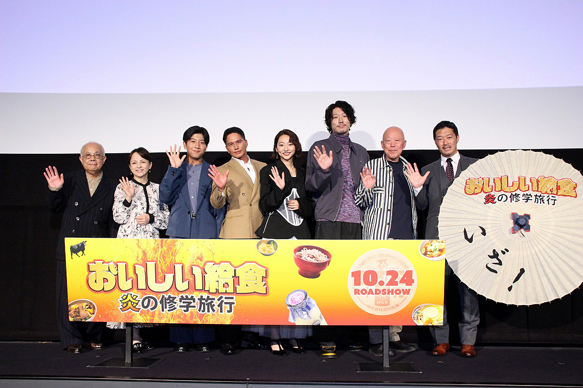 映画『おいしい給食 炎の修学旅行』完成披露舞台挨拶が都内で行われ、主演の市原隼人、共演の武田玲奈、田澤泰粋、小堺一機、いとうまい子、栄信、六平直政とメガホンを取った綾部真弥監督が登壇して楽しいクロストークを行われた。