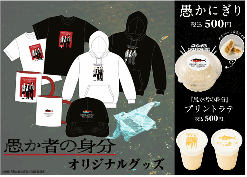 なお、『愚か者の身分』公開を記念し、オリジナルグッズ&限定フード販売が決定。赤坂ブランチパーク前の特設キッチンカーでは、「映画のアジを味わってほしい!」をテーマにした限定メニュー“愚かにぎり”などを10/18(土)-26(日)の期間で販売、PLAZA赤坂店では10/24(金)-31(金)の期間中、劇中アイテムの展示やオリジナルグッズの販売を実施。さらに期間中にはマモル役の林 裕太が“初店長”として登場を予定するなど、映画『愚か者の身分』の公開を記念して、作品の世界を“味わえる”特別企画を開催する。