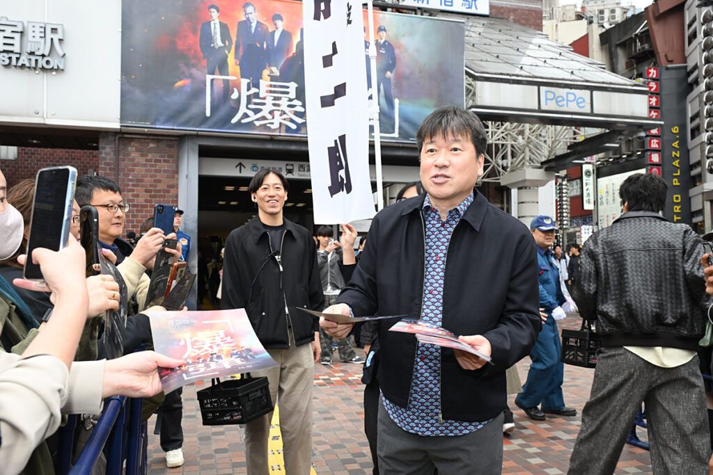 西武新宿駅前のペペ広場に突如現れた山田と佐藤。「『爆弾』観てください、お願いします!」と笑顔で声をかけながら、自らの手でチラシを配布。思わぬ直接アピールに、受け取った人々からは驚きと歓喜の声が上がり、広場は瞬く間に興奮の渦に包まれた。