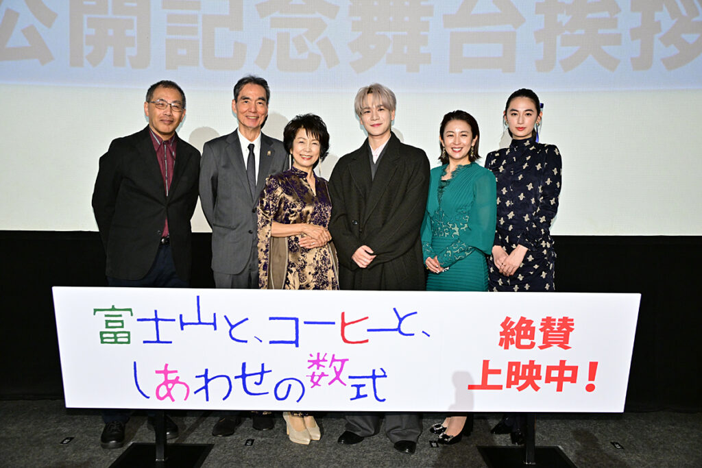 島田依史子氏の著作を原案にした映画『富士山と、コーヒーと、しあわせの数式』がついに全国公開! 初日翌日の10月25日(土)には池袋HUMAXシネマズにて公開記念舞台挨拶が実施され、W主演の豆原一成(JO1)と市毛良枝、共演の酒井美紀、八木莉可子、長塚京三、そして中西健二監督が登壇した。