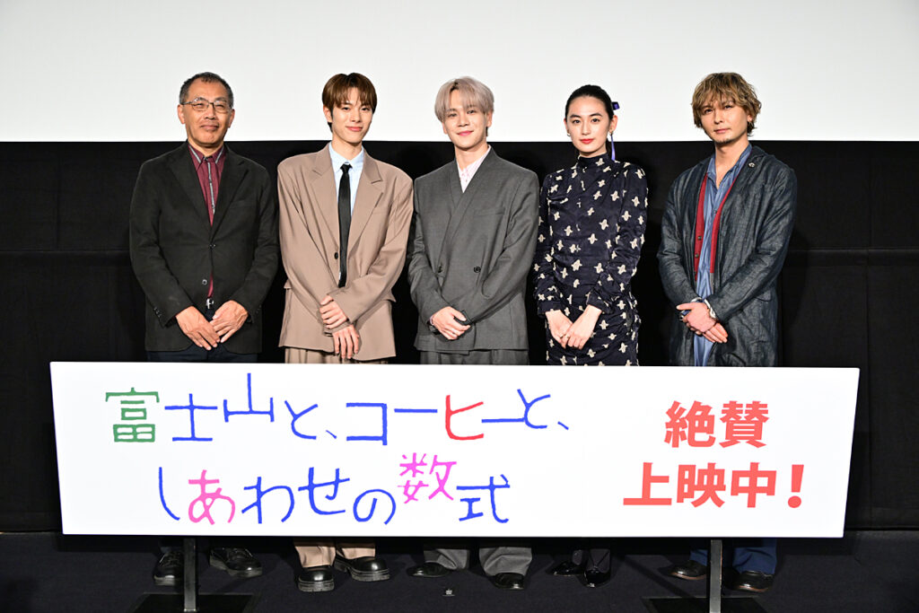 島田依史子氏の著作を原案にした映画『富士山と、コーヒーと、しあわせの数式』がついに全国公開! 初日翌日の10月25日(土)には新宿ピカデリーにて公開記念舞台挨拶が実施され、主演の豆原一成(JO1)、共演の八木莉可子、福田歩汰(DXTEEN)、藤田 玲、そして中西健二監督が参加した。
