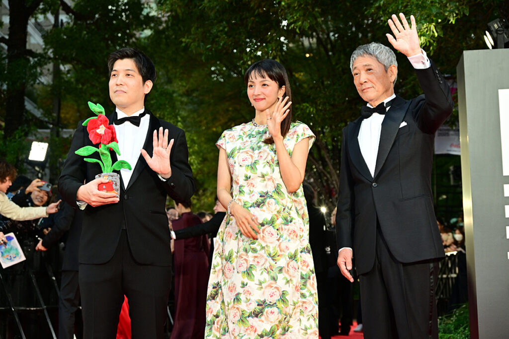 今回が初参加の⼩林は、フォトセッションでは少し緊張した様⼦を⾒せながらも終始にこやかな笑みを浮かべてゆっくりレッドカーペットを歩いていた。⼀⽅、満島は⼩林と⽊下監督と楽しそうに会話を弾ませながらも、沿道に集まったファンからの熱烈な声がけに照れた表情を浮かべてサインに応じていた。終点近くで待機していた報道陣からハートポーズをリクエストされると、⼩林がぎこちなくも⼿でハートを作る姿に満島が思わず吹き出す場⾯も。3⼈とも和気藹々としながら東京国際映画祭ならではのレッドカーペットを楽しんでいる様⼦だった。