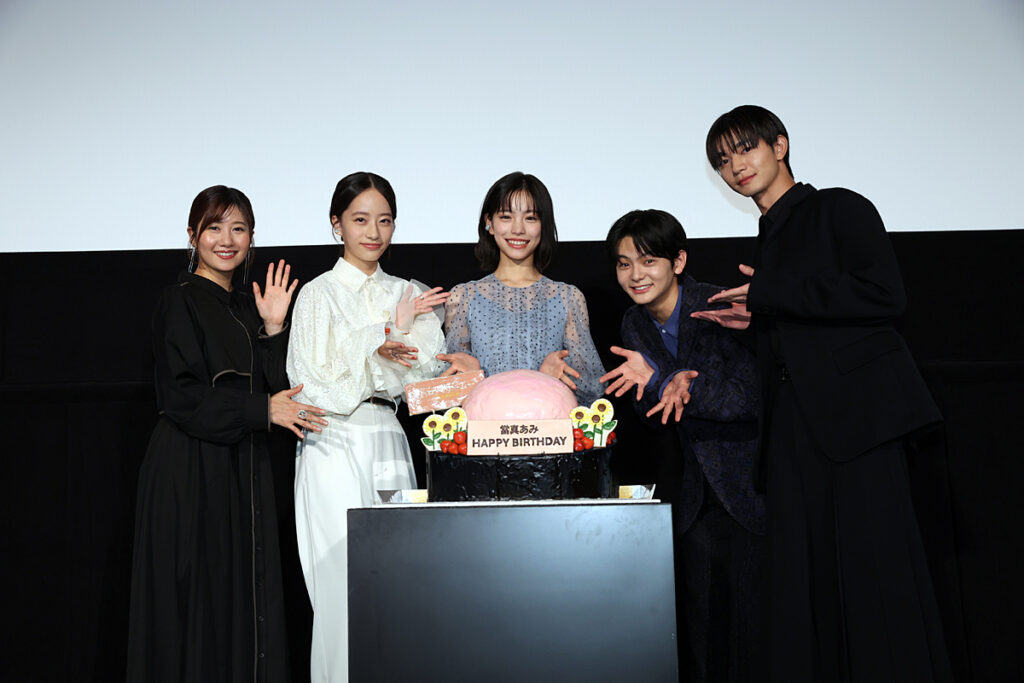 この日はさらにサプライズが。11月2日が當真の19歳の誕生日ということで、サプライズで特製バースデー・ケーキが登場。それには「自分の誕生日がもうちょっとだっていうのを忘れていました」と驚きを隠せない様子の當真だったが、そんな彼女に向かって会場が一体となって「當真あみさん、お誕生日おめでとうございます!」の大合唱。その祝福の言葉に感激した様子の當真は「『ストロベリー・ムーン』を撮影していた時はまだ高校3年生だったんですけど、今、ちょうど高校生を卒業して。これからはしっかりと自分で考えながら頑張っていきたいなと思っているので。こうやってお祝いしてくださる方がこんなにいっぱいいることが今、とてもうれしくて。これからもっと自分の誕生日を祝っていただけるような人でありたいなと思います」と決意を語った。
