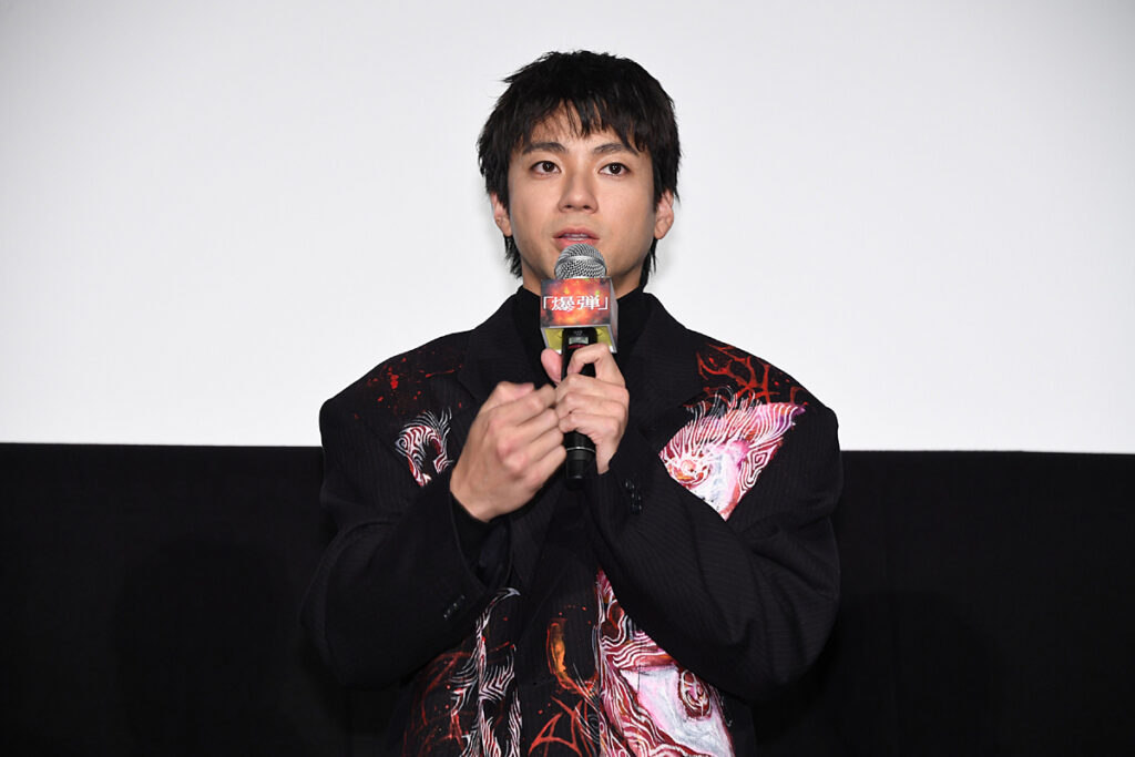 ハロウィンで賑わう夜、劇場でも『爆弾』キャスト陣が熱狂を巻き起こした。初めての上映後舞台挨拶となった本イベントは、上映が終了した途端に拍手喝采が巻き起こった。客席通路を通って登場すると、ハロウィンカラーのミニ花束を観客に投げ込み、笑顔を見せるたびに会場は大歓声。序盤から“爆弾級”の盛り上がりを見せた。
