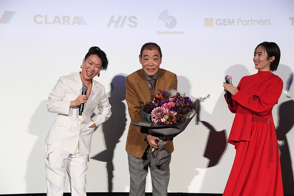 イベント後半では、11月3日(月・祝)に77歳の誕生日を迎えた柄本 明へ、サプライズのバースデーセレモニーを実施。真飛から喜寿にちなんだ紫色の花束が贈呈され、HIKARI監督先導のもとハッピー・バースデーの合唱が送られた。