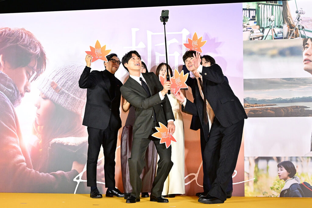 12月19日(金)の全国公開を控え、多くのアーティストにカバーされ27年にわたり愛され続けるスピッツの名曲「楓」を原案に、新たなラブ・ストーリーとして描かれる映画『楓』。W主演の福士蒼汰と福原 遥、共演の宮沢氷魚、石井杏奈、宮近海斗(Travis Japan)、そして行定 勲監督が、公開を目前に控えた11月13日(木)、都内にて開催されたジャパンプレミア・カーペットイベントに登壇した。同劇場ロビーで実施されたのは“レッドカーペット”ならぬ“楓色”カーペットイベント。キャスト&監督は会場に敷き詰められた鮮やかな“楓色”のカーペットにラインナップし、会場に詰め掛けた観客ににこやかに手を振りながら歓声に応えた。