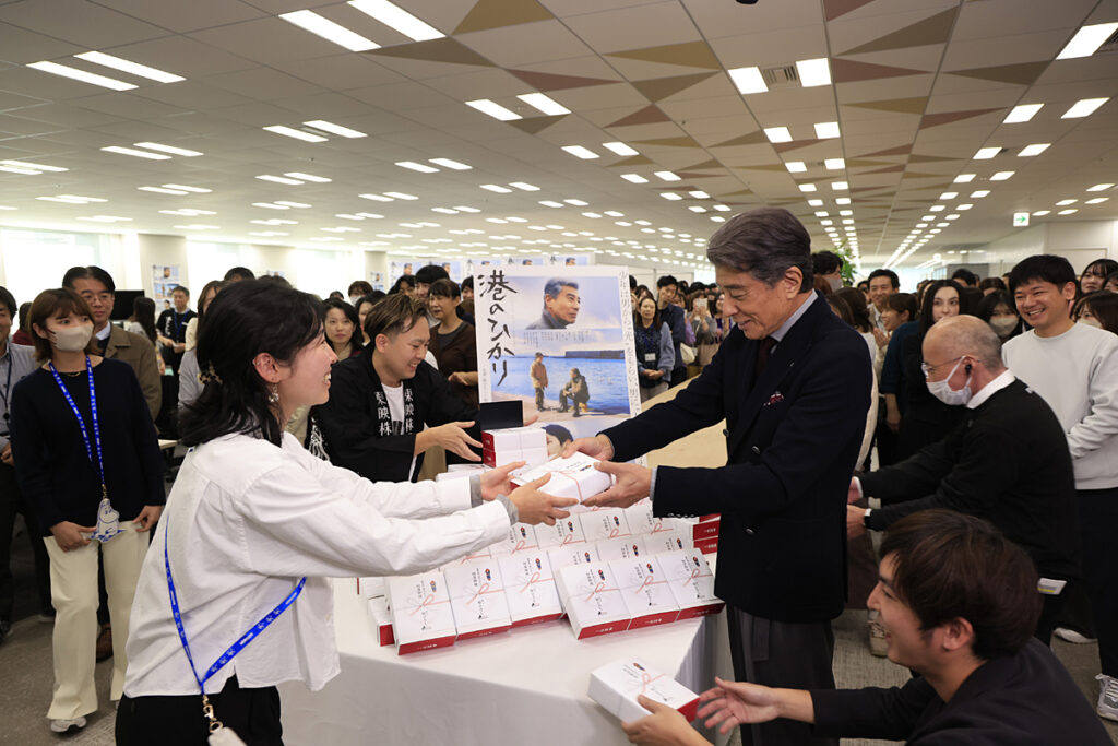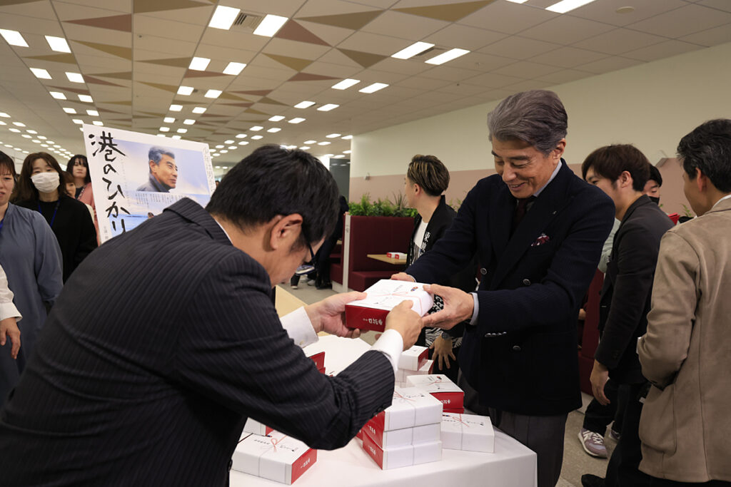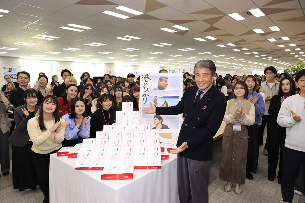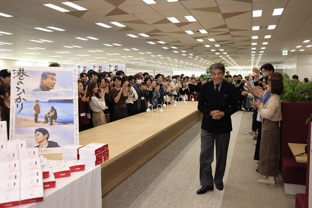 舘の登場により、オフィス全体が一気に公開初日のお祝いムードで包まれる中、大勢の社員で埋め尽くされたオフィスを見渡しながら、「本当に東映(のオフィス)だとは信じられない」と移転前の旧オフィスと見比べた本音をポツリ。「私は初めて出演した(東映配給作品の)映画を撮り終えた後に、東映の本社に行ったら岡田(裕介)社長がいらっしゃったんです。“お前、ええな”と褒めてくれて。人のことを呼び捨てにして、“なんだこの人は”と正直思っていたんですが、その方が社長でした」と笑顔で懐かしい思い出を披露する舘。当時の東映オフィスを思い返しながら「映画会社がこんな感じでいいのかと思ったことを記憶しているんですが、素晴らしい(オフィス)ですね。私のおかげです(笑)」とジョークを交えながら愛情たっぷりにコメントし、笑いを誘っていた。そして「今日から映画『港のひかり』が公開になるということで、よろしくお願いいたします」と本日公開を迎えたことをPRする舘。「“東映”(になぞらえて)108個のおはぎを用意しました」と明かすと、会場からは大きな拍手が湧き起こり、マスコミ向けのフォトセッションののち、“おはぎセレモニー”が開催された。