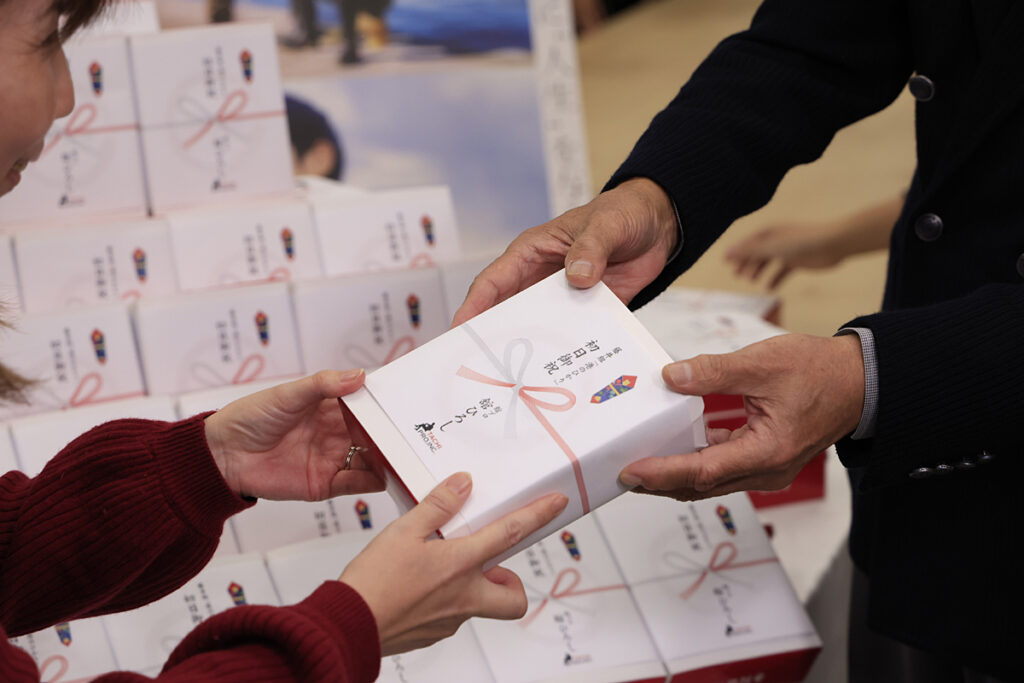 まず“おはぎセレモニー”の開催を記念してマスコミ向けのフォトセッションを実施。終始和やかなムードに包まれながら記念撮影を終えると、早速舘から東映社員に向けておはぎの手渡しが行われた。社員一人ひとりに対し目を見つめながら「ありがとうございます」と感謝の気持ちとともに、丁寧におはぎを手渡していく舘。そんな舘の優しさあふれる神対応に感激しきりの社員の姿も見受けられ、スターの佇まいにオフィスは熱狂に包まれた。
