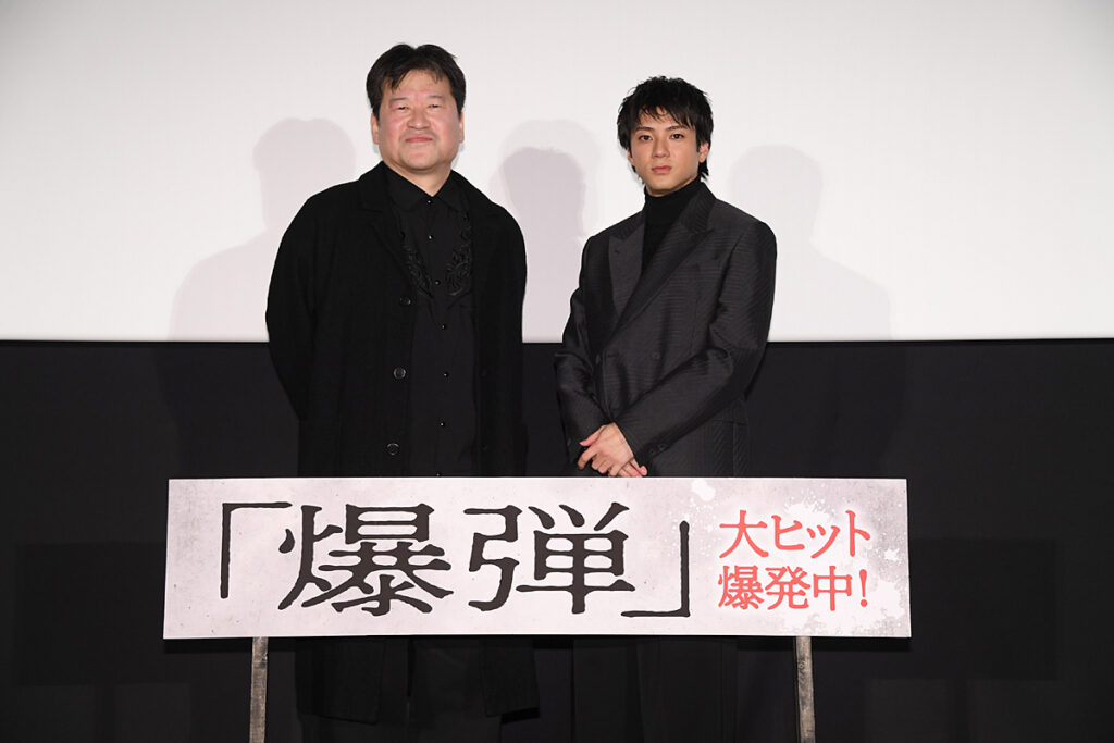 主演にして、警視庁捜査一課・強行犯捜査係の刑事・類家を演じた山田裕貴は、「先週の金曜から3週目に突入して、またこうして舞台挨拶をできるということは、映画にとって、この映画を作ったここにいないすべての『爆弾』チームの人たちにとって一番喜ばしいことだと思うので、めちゃくちゃ嬉しいです。今日はありがとうございます。よろしくお願いいたします」と挨拶し、刑事たちを翻弄する謎の中年男・スズキタゴサクを演じた佐藤二朗は、「毎日もう10年くらい連絡を取っていなかった人からや、本当にすごい熱量の感想のメールが来て。今日幼馴染の中島というやつから連絡があって、『爆弾』を観たのかと思ったら全然違う用件でびっくりしました(笑)。それがびっくりするくらい毎日しかも長文の感想が来て、初めてですよ。『爆弾』チームにとっても、今年日本映画が元気ですごく嬉しい。その一言です」と驚くほどの反響ぶりを語った。