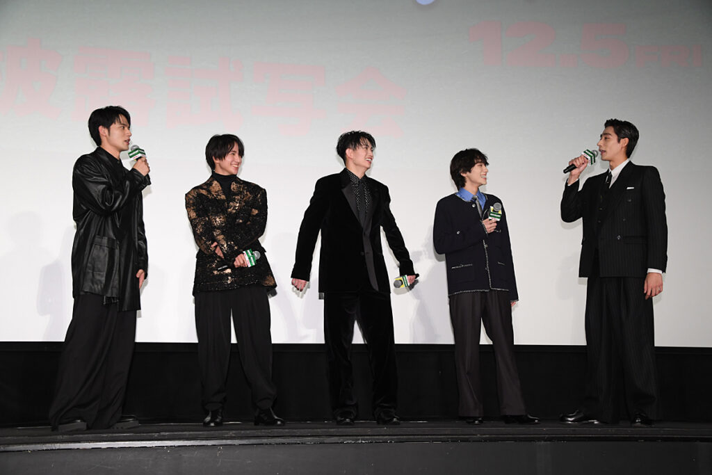男性キャスト陣は黒を基調としたスタイルで統一され、紅一点の八木莉可子は気品漂うゴールドのドレスで登場。水上恒司が八木の手を取ってエスコートしながら階段を下りると、観客席からは大きな歓声が。続いて木戸大聖と上杉柊平が、照れ笑いを浮かべる綱啓永を両側から支える“二段エスコート”で登場し、早くも和やかなムードをつくり上げた。