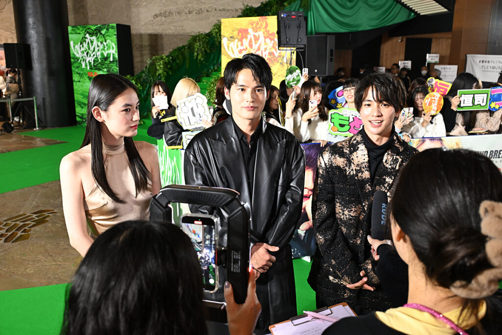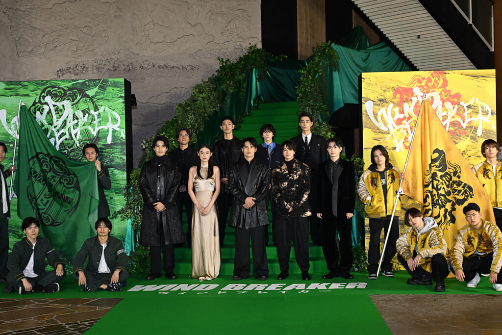 本編上映に先立って行われた“グリーンカーペット”イベントには、豪華キャストと萩原監督が勢ぞろい。<防風鈴>を象徴するグリーンの階段に姿を現した瞬間、会場の熱気は一気に高まった。パフォーマーたちが旗を翻しながら先導すると、キャスト陣がゆっくりと階段を下りて登場──完成披露にふさわしい華やかさとスケール感に、観客は開始早々から大興奮!