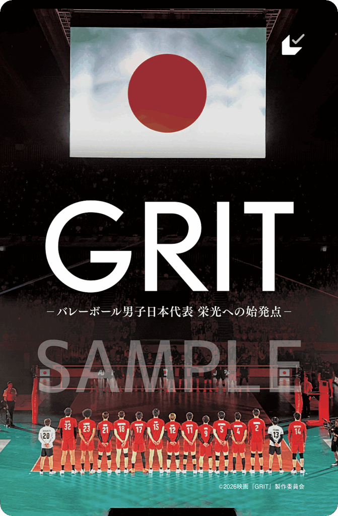 さらにこの度、映画『GRIT —バレーボール男子日本代表 栄光への始発点—』のムビチケ前売券(カード型)が、12月5日(金)より発売されることが決定した。カードデザインには、日本代表の象徴である背番号を背負った選手たちの姿と、大観衆の前に掲げられた日の丸が印象的に映し出された、本作の世界観を象徴するビジュアルを採用。コートに立つ選手たちの緊張感と誇りが伝わる、記念性の高い一枚に仕上がっている。