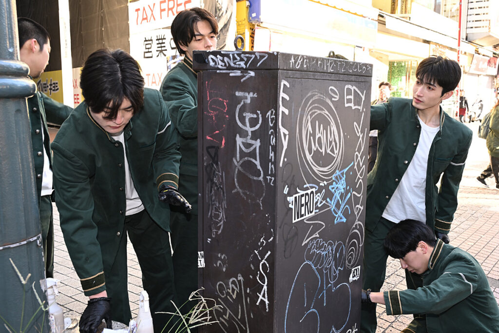 まだ静けさの残る早朝の渋谷に、ツナギ姿の水上、綱、濱尾が集結。「渋谷の街をキレイにします!」と気合十分に、渋谷区環境整備課職員のレクチャーを受けたのち、緑の学ランに身を包んだ<防風鈴>の生徒たちとともに落書き清掃を開始。