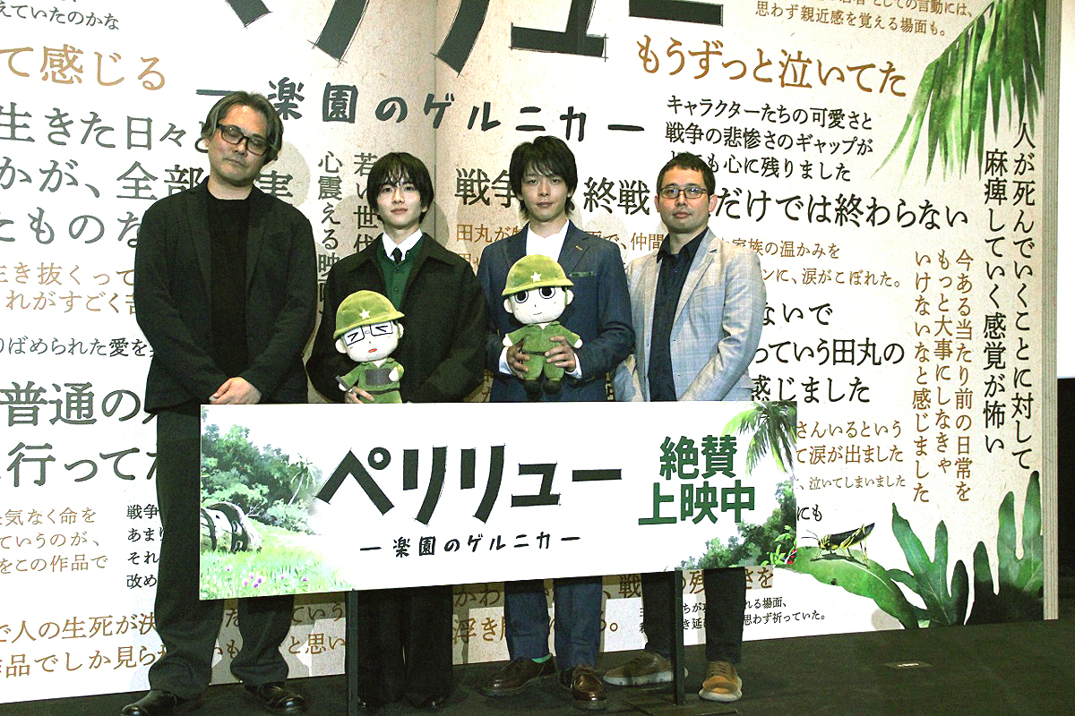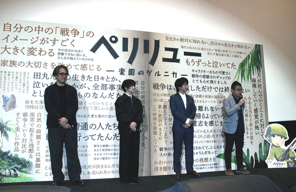 映画『ペリリュー -楽園のゲルニカ-』公開初日舞台挨拶が都内で行われ、声優を務めた、板垣李光人、中村倫也、メガホンをとった久慈悟郎監督と原作・共同脚本の武田一義が登壇して作品についてクロストークを行った。