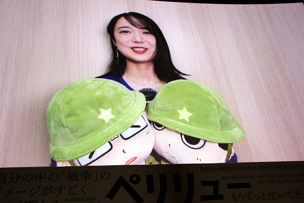 キャスト陣の立つ後ろのボードには、試写などで作品をいち早く観た人たちからの感想が書かれており、映像と内容のギャップに触れている感想も多かった。板垣は「絵のタッチは可愛らしいのですが、お話はリアルに戦争の残酷さを伝えています」と話し、ペリリュー島の美しい色彩の中で繰り広げられた凄惨な戦争の有り様を、全世代の人々に伝えることができるように描かれたことに感心し、称賛した。
