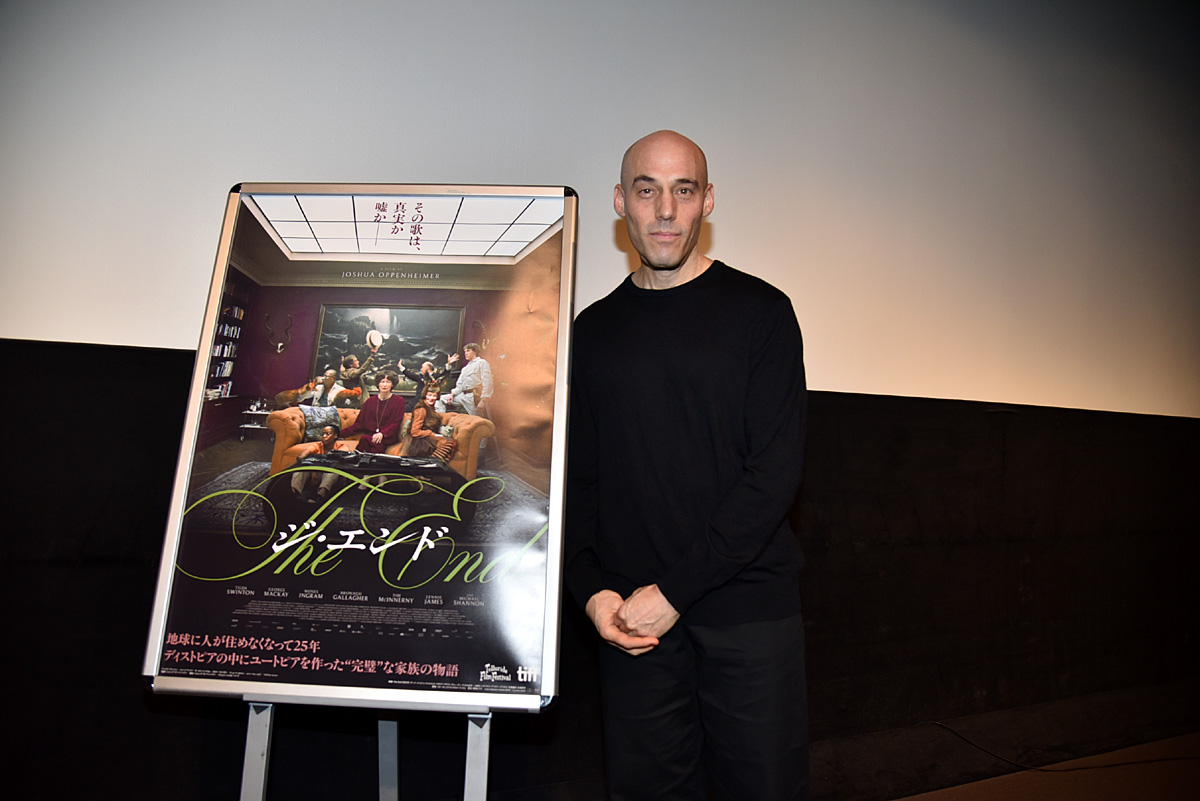 『アクト・オブ・キリング』、『ルック・オブ・サイレンス』で世界的に注目を集めたジョシュア・オッペンハイマー監督が主演にティルダ・スウィントンを迎えた黙示録的ミュージカル『THE END(ジ・エンド)』(公開中)。この度、本作の公開に合わせてオッペンハイマー監督が来日し、12月13日(土)にヒューマントラストシネマ有楽町にて舞台挨拶を行なった。