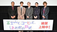 島田依史子氏の著作を原案にした映画『富士山と、コーヒーと、しあわせの数式』がついに全国公開! 初日翌日の10月25日(土)には池袋HUMAXシネマズにて公開記念舞台挨拶が実施され、W主演の豆原一成(JO1)と市毛良枝、共演の酒井美紀、八木莉可子、長塚京三、そして中西健二監督が登壇した。